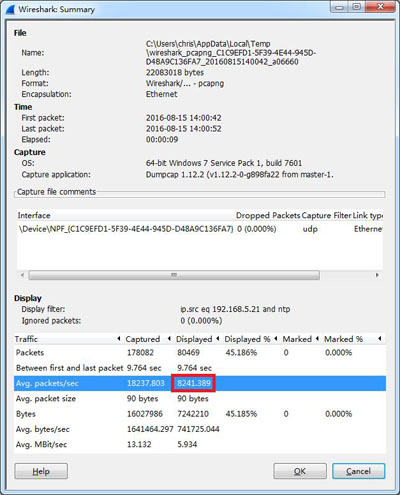 點擊菜單“Statistics/Summary”,得到每秒NTP響應數量